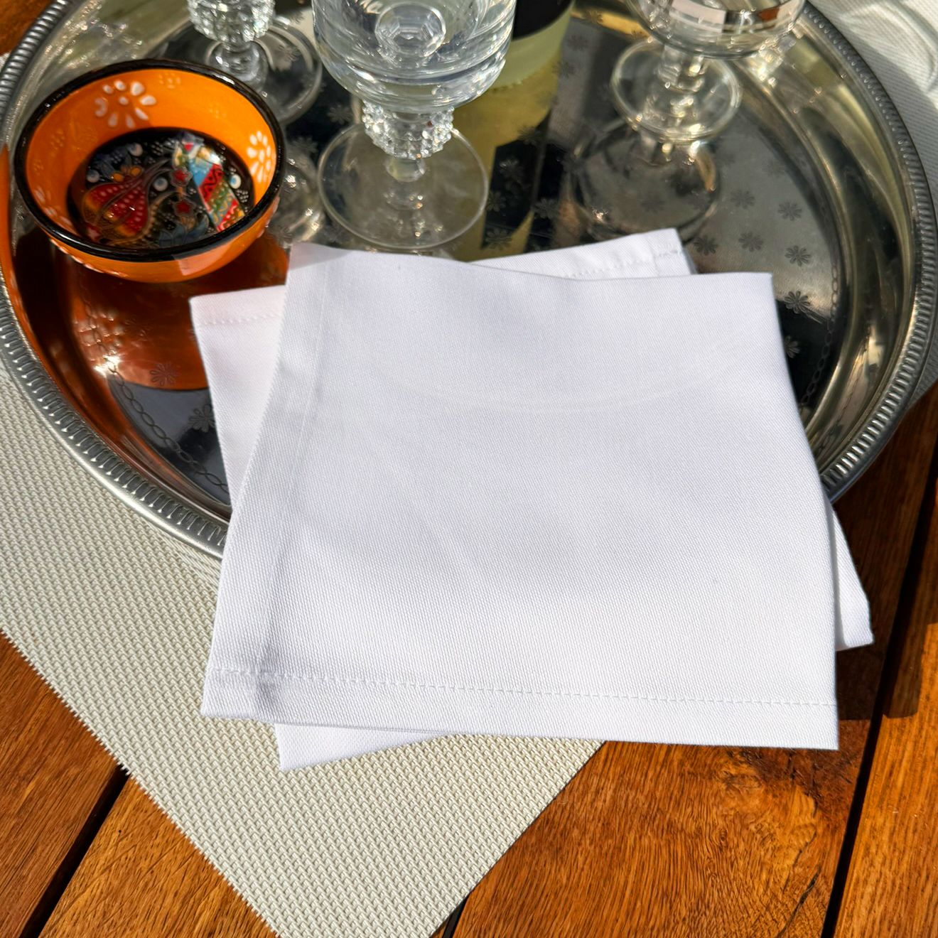 Wir bieten Ihnen hier fünfzig ganz exklusive weiße Cocktailservietten aus Stoff. Die eleganten Servietten ohne Muster sind 30x30 cm groß und besitzen ein gefaltetes Maß von 15x15 cm, sie sind also sehr klein – optimal für Fingerfood, kleine Snacks oder schmackhafte Appetizer, die man auf die Hand nehmen und dann essen kann.